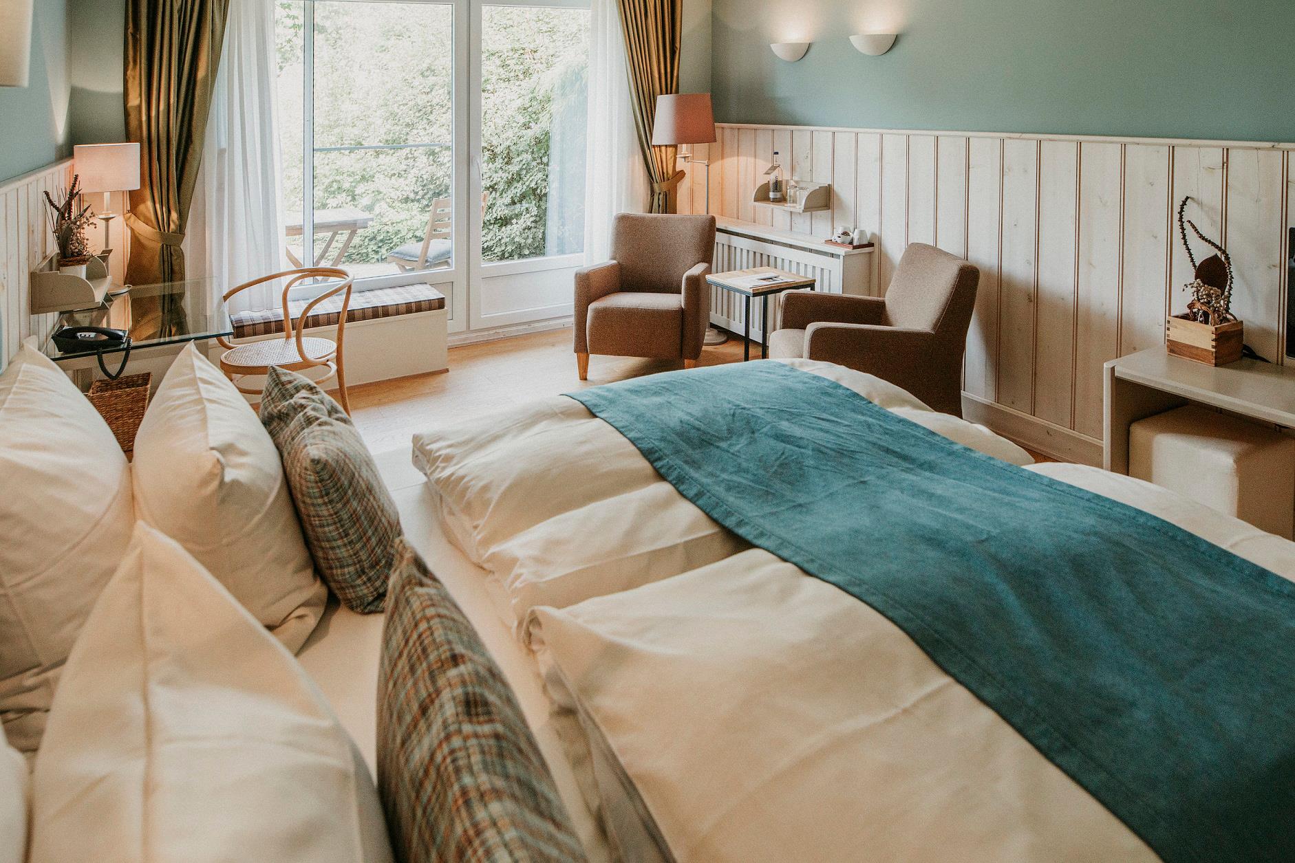 De rummelige værelser (19-22 m²) er indrettet i moderne landstil, lyse og praktiske og med en dejlig udsigt over parken og den nærtliggende skov. Værelserne har alle nye, komfortable boxmadresser (160 cm brede) samt eget badeværelse med badekåbe, tøfler og håndklæder til låns. Derudover er der også et skrivebord med stol, fladskærms-TV, gratis WiFi, hårtørrer og toiletartikler.